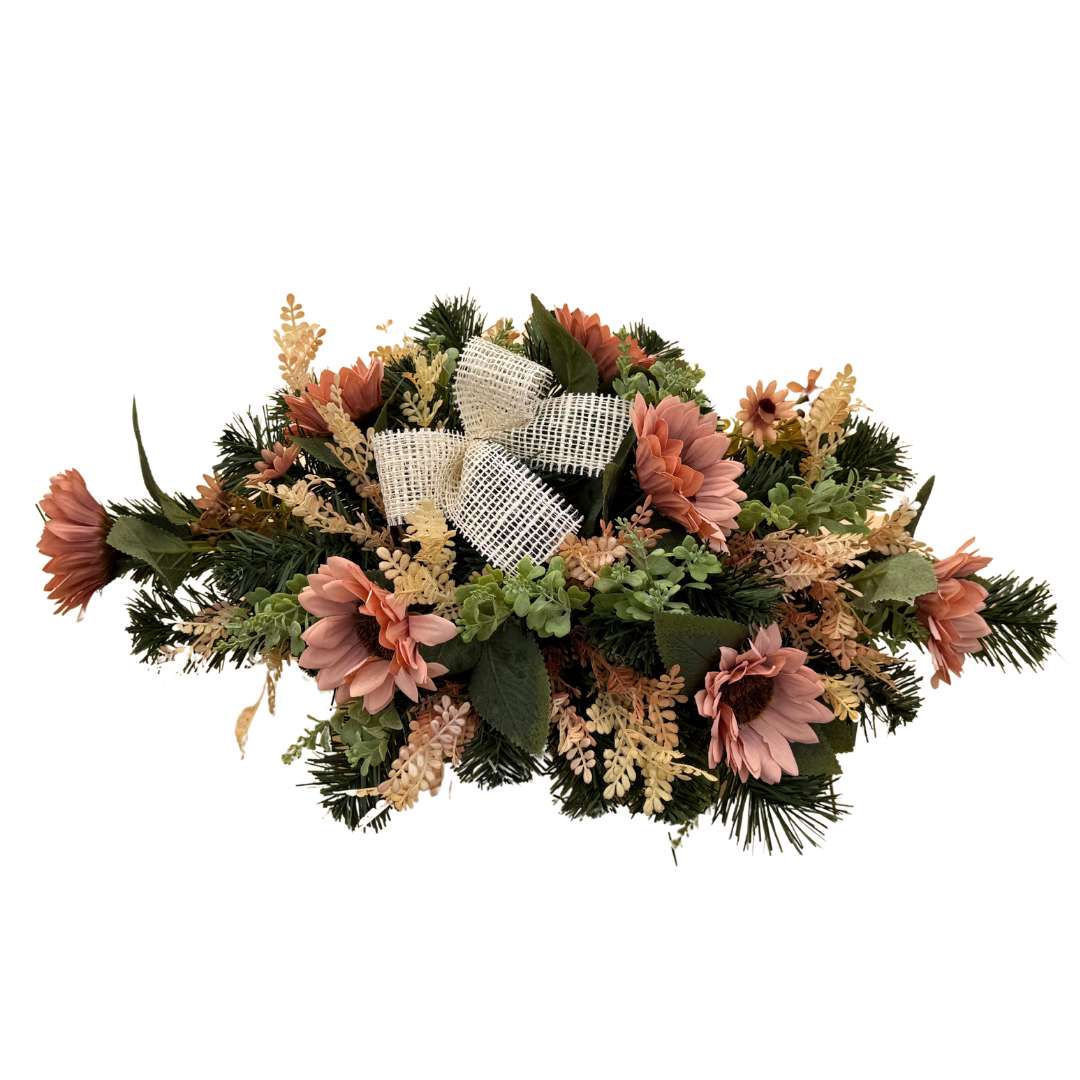 Dušičkový aranžmán ružový na hrob – dôstojná spomienka prehovorí za vás. V čase, keď spomienka na blízkych dostáva zvláštnu hĺbku. Dušičková ikebana stelesňuje pokoj, úctu a večnosť. Precízne naaranžovaná kombinácia umelej čečiny, elegantných kvetov a decentných dušičkových doplnkov. Vytvára harmonický celok a dôstojne doplní každý hrob. Exkluzívny spomienkový aranžmán a dekorácia z umelých a prírodných materiálov.